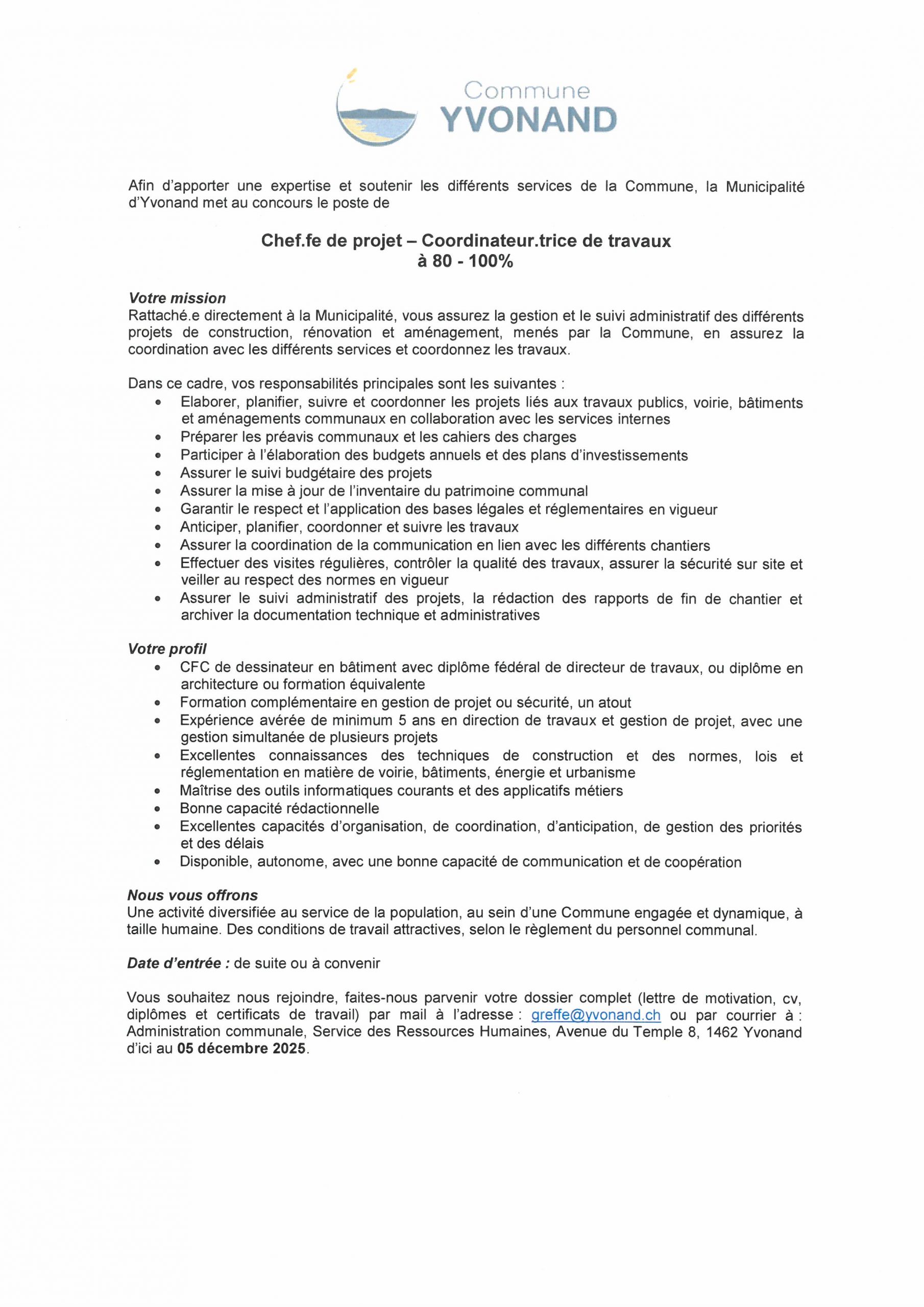Afin d’apporter une expertise et soutenir les différents services de la Commune, la Municipalité d’Yvonand met au concours le poste de