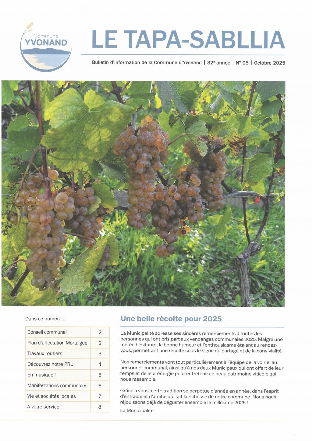 Une belle récolte pour 2025 (…) – Conseil communal du 25 août 2025 et 29 septembre 2025 (…) – Plan d’affectation PA Mortaigue (…), présentation publique le mercredi 19 novembre 2025 à 19h00 au Forum – Dates des prochaines Conseils communaux (…) – Travaux d’entretien routier (…) – Conférence sur l’efficience énergétique des bâtiments le jeudi 13 novembre 19h45 (…) – Délais rédactionnels et parutions du Tapa-Sabllia (…) – Votre publicité dans le journal (…) – Exercice de la Protection Civile : découvrez le Point de Rencontre d’Urgence (PRU), le vendredi 7 novembre 2025 à 14h15 (…) – Les vendanges 2025, un vrai succès ! (…) – Concerts “Pleins-Jeux” : L’Avent s’enchante avec ORCHIS (…), le samedi soir 6 décembre 2025 à 20h00 – Le Choeur d’hommes de Démoret au marché hebdomadaire (…) – Annonce d’emploi – Camping de la Menthue (…) – Halloween au marché hebdomadaire le jeudi 30 octobre 2025, de 16h00 à 19h00 (…) – Un petit marché de Noël aura lieu à la salle polyvalente le jeudi 18 décembre 2025 de 16h00 à 21h30, réservez dès maintenant votre stand en contactant Mme Christelle Fresneau (christelle.fresneau@yvonand.ch) (…) – Vie et sociétés locales (…) – Publicités (…)