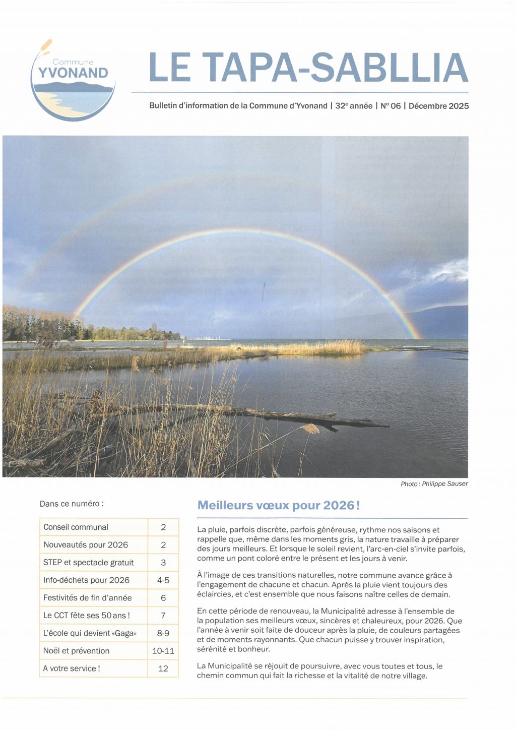 Meilleurs voeux pour 2026 ! (…) – Conseil communal (…) – Dates des prochains conseils communaux (…) – Nouveaux horaires de l’administration, quelques changements dès le 01.01.2026 (…) – Outil de réservation des salles en ligne (…) – STEP : travaux de réhabilitation en cours (…) – Spectacle gratuit : La légende du chevalier vert, le dimanche 25 janvier 2026 à 17h00 à la Salle polyvalente (…) – Délai rédactionnels et parution du Tapa-Sabllia (…) – Votre publicité dans le journal ? (…) – Gestion des déchets : la collectivité adopte de nouvelles règles, nouvelles mesures à la déchetterie dès le 1er janvier 2026 (autorisation d’accès à la déchetterie 2026) (…) – Atelier d’artisanat et de rencontres 2026 (…) – Vie et sociétés locales (…) – Le Club de Tennis de Table d’Yvonand fête ses 50 ans (…) – Ecole : Radio Gaga à Yvonand (…) – Un détour par l’Antiquité grecque (…) – Information importante “FRELON ASIATIQUE” (…) – Publicité (…) – Déneiger son véhicule : un geste simple pour la sécurité (…) – Publicité (…)