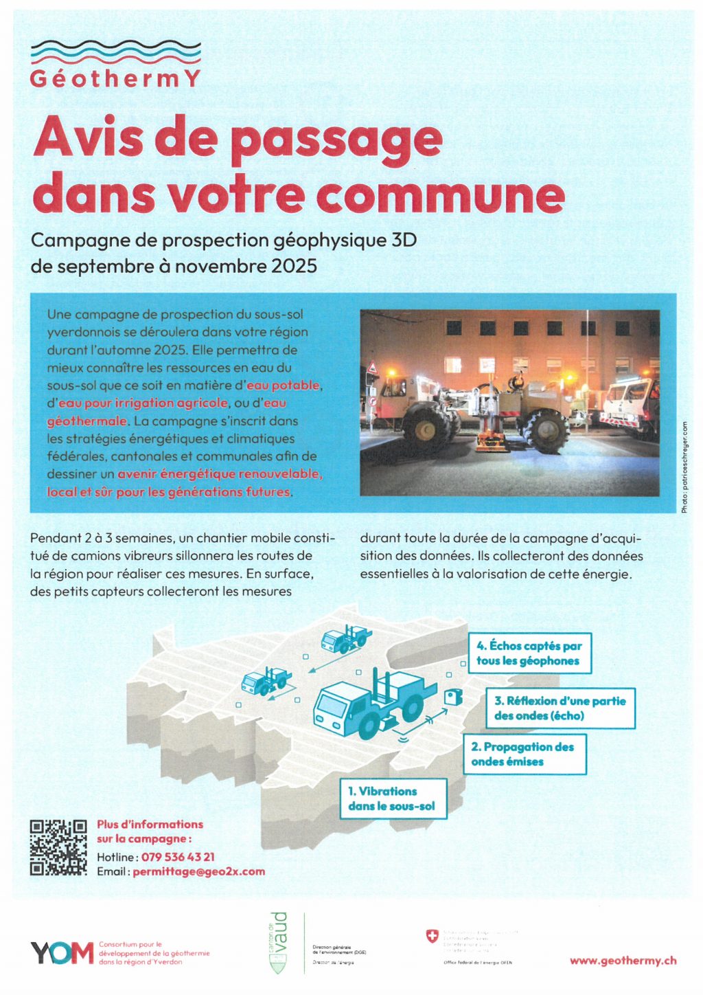 Une campagne de prospection du sous-sol yverdonnois se déroulera dans votre région durant l’automne 2025. Elle permettra de mieux connaître les ressources en eau du sous-sol que ce soit en matière d’eau potable , d’0eau pour irrigation agricole, ou d’eau géothermale. La campagne s’inscrit dans les stratégie énergétiques et climatiques fédérales, cantonales et communales afin de dessiner un avenir énergétique renouvelable, local et sûr pour les générations futures.